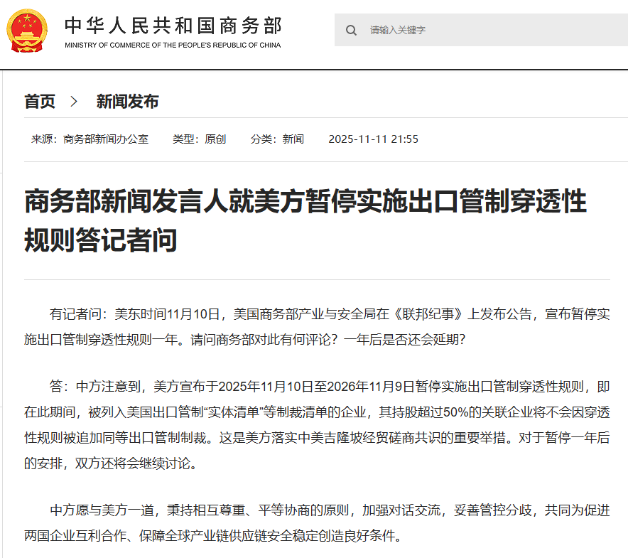 有记者问:美东时间11月10日,美国商务部工业与安全局在联邦公报发布公告,宣布暂停执行渗透控制规则一年。商务部对此有何评论?一年后可以延期吗?答:中方注意到美方宣布自2025年11月10日至2026年11月9日暂停实施渗透控制政策。这是美方落实吉隆坡经济会议共识的重要举措。中美之间的IC和贸易磋商。暂停一年后,双方将继续讨论和解事宜。中方愿同美方一道,秉持相互尊重、平等协商的原则,加强对话交流,妥善管控分歧,共同为促进两国企业互利合作、保障全球产业链供应链安全稳定创造有利条件。网站截图